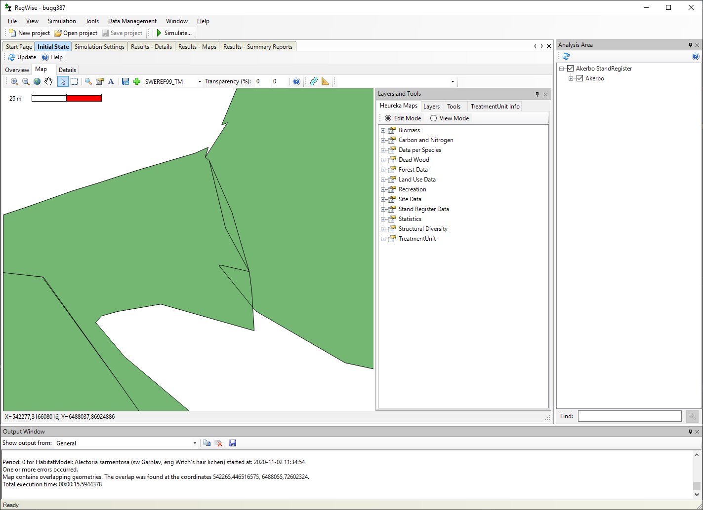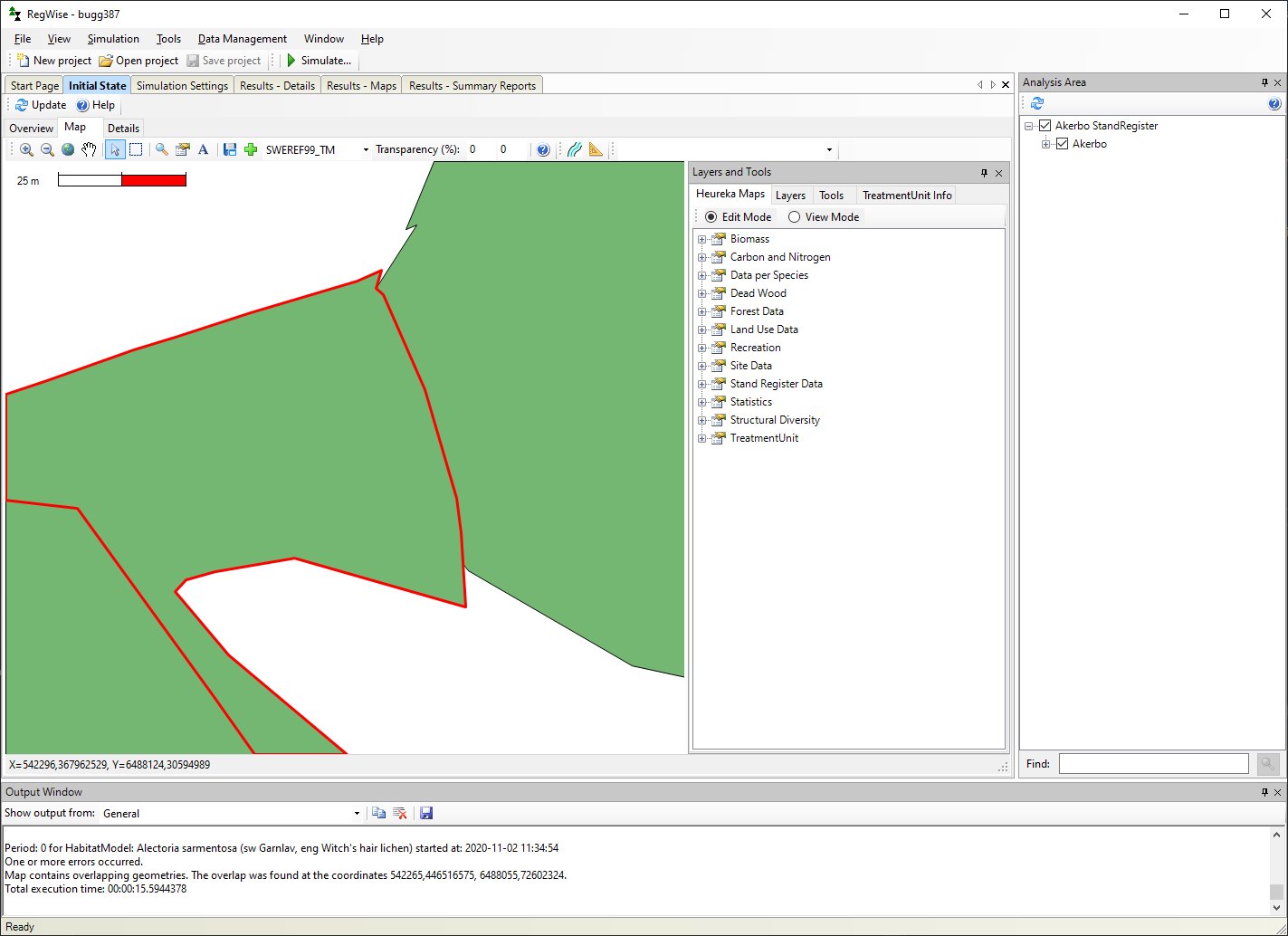 | Steps To Reproduce | 1. Hämta beståndsregisterfil och shapefiler här: https://www.dropbox.com/s/1cgnnex5puglmcm/bugg387.zip?dl=0 2. Importera i RegVis i nytt projekt 3. Kör simulering med t ex 20 perioder. Det är bara drygt 400 bestånd så det går snabbt. 4. Välj "Kör habitatmodell" från Verktygs-menyn, och försöka köra den första artmodellen på den nyss gjorda simuleringen. Resultat: "Ett fel uppstod..." | ||||