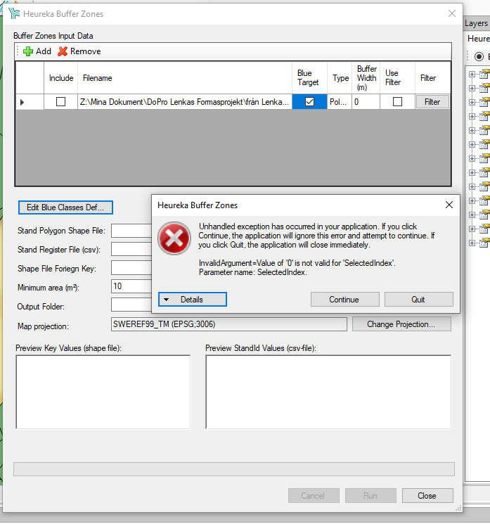 See the end of this message for details on invoking just-in-time (JIT) debugging instead of this dialog box. ************** Exception Text ************** System.ArgumentOutOfRangeException: InvalidArgument=Value of '0' is not valid for 'SelectedIndex'. Parameter name: SelectedIndex at System.Windows.Forms.ComboBox.set_SelectedIndex(Int32 value) at Slu.Heureka.Geoprocessing.UI.Helpers.BlueTargetClassControl.bindData(String currentWidthColname, String currentBlueTargetColName) at Slu.Heureka.Geoprocessing.UI.Helpers.BlueTargetClassDialog..ctor(BlueClassBufferFileItem fileItem) at Slu.Heureka.Geoprocessing.UI.BufferZones.BufferZonesDialog.editBlueClassDefButton_Click(Object sender, EventArgs e) at System.Windows.Forms.Control.OnClick(EventArgs e) at System.Windows.Forms.Button.OnClick(EventArgs e) at System.Windows.Forms.Button.OnMouseUp(MouseEventArgs mevent) at System.Windows.Forms.Control.WmMouseUp(Message& m, MouseButtons button, Int32 clicks) at System.Windows.Forms.Control.WndProc(Message& m) at System.Windows.Forms.ButtonBase.WndProc(Message& m) at System.Windows.Forms.Button.WndProc(Message& m) at System.Windows.Forms.NativeWindow.Callback(IntPtr hWnd, Int32 msg, IntPtr wparam, IntPtr lparam) ************** Loaded Assemblies ************** mscorlib Assembly Version: 4.0.0.0 Win32 Version: 4.8.4084.0 built by: NET48REL1 CodeBase: file:///C:/Windows/Microsoft.NET/Framework64/v4.0.30319/mscorlib.dll ---------------------------------------- PlanWise Assembly Version: 2.21.3.0 Win32 Version: 2.21.3.0 CodeBase: file:///C:/Program%20Files/Heureka%20SLU%2064/PlanWise.exe ---------------------------------------- log4net Assembly Version: 1.2.15.0 Win32 Version: 1.2.15.0 CodeBase: file:///C:/Program%20Files/Heureka%20SLU%2064/log4net.DLL ---------------------------------------- System.Windows.Forms Assembly Version: 4.0.0.0 Win32 Version: 4.8.4084.0 built by: NET48REL1 CodeBase: file:///C:/WINDOWS/Microsoft.Net/assembly/GAC_MSIL/System.Windows.Forms/v4.0_4.0.0.0__b77a5c561934e089/System.Windows.Forms.dll ---------------------------------------- System Assembly Version: 4.0.0.0 Win32 Version: 4.8.4084.0 built by: NET48REL1 CodeBase: file:///C:/WINDOWS/Microsoft.Net/assembly/GAC_MSIL/System/v4.0_4.0.0.0__b77a5c561934e089/System.dll ---------------------------------------- System.Drawing Assembly Version: 4.0.0.0 Win32 Version: 4.8.4084.0 built by: NET48REL1 CodeBase: file:///C:/WINDOWS/Microsoft.Net/assembly/GAC_MSIL/System.Drawing/v4.0_4.0.0.0__b03f5f7f11d50a3a/System.Drawing.dll ---------------------------------------- Slu.Heureka.DomainLayer Assembly Version: 2.21.3.0 Win32 Version: 2.21.3.0 CodeBase: file:///C:/Program%20Files/Heureka%20SLU%2064/Slu.Heureka.DomainLayer.DLL ---------------------------------------- Slu.Heureka.BaseLayer Assembly Version: 2.21.3.0 Win32 Version: 2.21.3.0 CodeBase: file:///C:/Program%20Files/Heureka%20SLU%2064/Slu.Heureka.BaseLayer.DLL ---------------------------------------- Slu.Heureka.ApplicationLayer.Common Assembly Version: 0.0.0.0 Win32 Version: 0.0.0.0 CodeBase: file:///C:/Program%20Files/Heureka%20SLU%2064/Slu.Heureka.ApplicationLayer.Common.DLL ---------------------------------------- DotNetMagic2005 Assembly Version: 5.3.0.0 Win32 Version: 5.3.0.0 CodeBase: file:///C:/Program%20Files/Heureka%20SLU%2064/DotNetMagic2005.DLL ---------------------------------------- System.Xml Assembly Version: 4.0.0.0 Win32 Version: 4.8.4084.0 built by: NET48REL1 CodeBase: file:///C:/WINDOWS/Microsoft.Net/assembly/GAC_MSIL/System.Xml/v4.0_4.0.0.0__b77a5c561934e089/System.Xml.dll ---------------------------------------- System.Configuration Assembly Version: 4.0.0.0 Win32 Version: 4.8.4084.0 built by: NET48REL1 CodeBase: file:///C:/WINDOWS/Microsoft.Net/assembly/GAC_MSIL/System.Configuration/v4.0_4.0.0.0__b03f5f7f11d50a3a/System.Configuration.dll ---------------------------------------- System.Core Assembly Version: 4.0.0.0 Win32 Version: 4.8.4084.0 built by: NET48REL1 CodeBase: file:///C:/WINDOWS/Microsoft.Net/assembly/GAC_MSIL/System.Core/v4.0_4.0.0.0__b77a5c561934e089/System.Core.dll ---------------------------------------- mscorlib.resources Assembly Version: 4.0.0.0 Win32 Version: 4.8.4084.0 built by: NET48REL1 CodeBase: file:///C:/WINDOWS/Microsoft.Net/assembly/GAC_MSIL/mscorlib.resources/v4.0_4.0.0.0_sv_b77a5c561934e089/mscorlib.resources.dll ---------------------------------------- System.Data Assembly Version: 4.0.0.0 Win32 Version: 4.8.4084.0 built by: NET48REL1 CodeBase: file:///C:/WINDOWS/Microsoft.Net/assembly/GAC_64/System.Data/v4.0_4.0.0.0__b77a5c561934e089/System.Data.dll ---------------------------------------- DotSpatial.Controls Assembly Version: 2.0.0.0 Win32 Version: 2.0 CodeBase: file:///C:/Program%20Files/Heureka%20SLU%2064/DotSpatial.Controls.DLL ---------------------------------------- DotSpatial.Data Assembly Version: 2.0.0.0 Win32 Version: 2.0 CodeBase: file:///C:/Program%20Files/Heureka%20SLU%2064/DotSpatial.Data.DLL ---------------------------------------- DotSpatial.Symbology Assembly Version: 2.0.0.0 Win32 Version: 2.0 CodeBase: file:///C:/Program%20Files/Heureka%20SLU%2064/DotSpatial.Symbology.DLL ---------------------------------------- DotSpatial.Projections Assembly Version: 2.0.0.0 Win32 Version: 2.0 CodeBase: file:///C:/Program%20Files/Heureka%20SLU%2064/DotSpatial.Projections.DLL ---------------------------------------- System.ComponentModel.Composition Assembly Version: 4.0.0.0 Win32 Version: 4.8.4084.0 CodeBase: file:///C:/WINDOWS/Microsoft.Net/assembly/GAC_MSIL/System.ComponentModel.Composition/v4.0_4.0.0.0__b77a5c561934e089/System.ComponentModel.Composition.dll ---------------------------------------- DotSpatial.GeoAPI Assembly Version: 1.7.4.0 Win32 Version: 1.7.4.0 CodeBase: file:///C:/Program%20Files/Heureka%20SLU%2064/DotSpatial.GeoAPI.DLL ---------------------------------------- ZedGraph Assembly Version: 5.1.7.430 Win32 Version: 5.1.7.430 CodeBase: file:///C:/Program%20Files/Heureka%20SLU%2064/ZedGraph.DLL ------------------