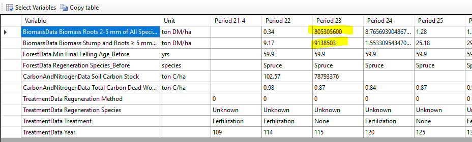 | Description | I vissa simuleringar blir rot-biomassan (och därmed kolmängderna i marken) vansinnigt höga, t ex över 8 miljoner ton/ha på en yta, där förväntat värde är ca 200 ton. Händer slumpmässigt på enstaka ytor. Svårt att återskapa på en given yta. | ||||