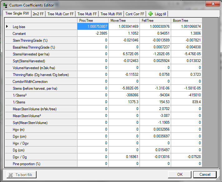 Forest Fuel Forw Cost Func: Kostnadsfunktion (koefficienter) för skotning.