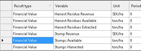 Extraction of biofuel is presented under the results category “Financial Value”. When a simulation is run in PlanWise or RegWise you have to select the variables you want to be saved in the Results database. In StandWise, they are calculated automatically.