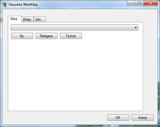 Skapa en egen anslutningFör att skapa en anslutning till en karttjänst som inte finns med i lista, välj Annat... i dropdown-listan ovan. Då öppnas ett formulär där du anger inställningar för en WMS- eller WMTS-tjänst. Dessa inställningar sparas och kommer att visas i dropdown-listan därefter.