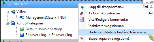 Bestånd kan helt undantas från en analys genom att högerklicka på en domän och välja Undanta tilldelade bestånd från analys. Detta ger ett helt annat annat resultat än Inaktivera skogsdomän, eftersom den senare inkluderar bestånden i analysen.