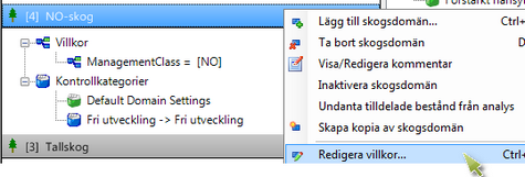 Ett bestånd placeras i den första domän (uppifrån) vars villkor är uppfyllda. Exempel: Om du har två domäner för tallskog, en som heter ”Tall” och en som heter ”Tallbestånd på torvmark” (med motsvarande villkor), ska ”Tall på torvmark” placeras överst. I annat fall kommer alla tallbestånd att hamna i domänen ”Tall”. Du kan ändra ordningen genom att högerklicka i titelraden för en domän och välja Flytta upp eller Flytta ned. I exemplet nedan har en domän skapats för NO-skog (Naturvård Orörd) som ska länas för fri utveckling. Denna ska ligga före domäner som inte har något villkor för målklassning, annars kommer tallbestånd som är NO-klassade att hamna i fel domän.