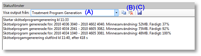 I statusfönstret som finns längst ner i vyn, visas statusinformation från systemet, t ex om hur en simulering fortskrider, eventuella fel eller konstigheter, och temporära optimeringsresultat. I listan (A) väljer du vilken information som ska visas. Med knappen Rensa (B) tömmer du fönstret. Du kan spara allt som skrivs ut till en text-fil genom att klick på Spara-knappen (C). Detta kan vara användbart när du gör en optimering, då kan du spara resultat som du kanske bara beräknar i optimeringsmodellen som inte finns i resultatdatabasen.